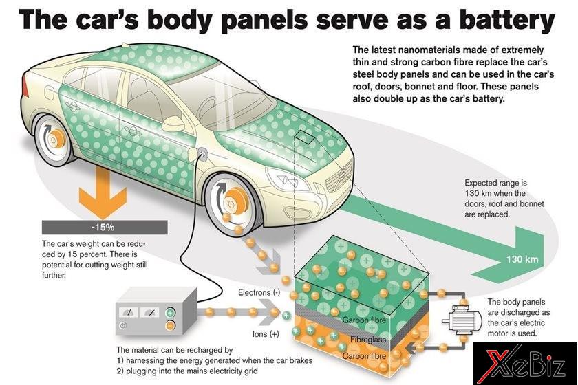 Bình ắc quy là phần chiếm trọng lượng nhiều nhất của một chiếc xe điện. Vì vậy, vào năm 2013, Volvo đã thử nghiệm tích hợp và lưu trữ trực tiếp năng lượng pin trên thân xe. Theo Volvo, công nghệ pin mới sẽ giúp xe điện giảm được trung bình 15% trọng lượng.