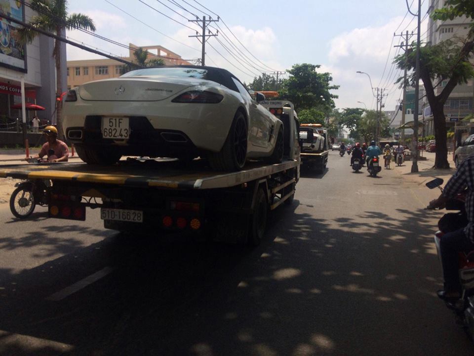 Vào chiều qua, ngày 15/3, chiếc siêu xe Mercedes-Benz SLS AMG đầu tiên cập bến Việt Nam và hiện đang thuộc sở hữu của đại gia Trung Nguyên đã bị bắt gặp nằm trên xe cứu hộ xuất hiện gần bến xe Ngã tư Ga, quận 12, Tp.HCM.