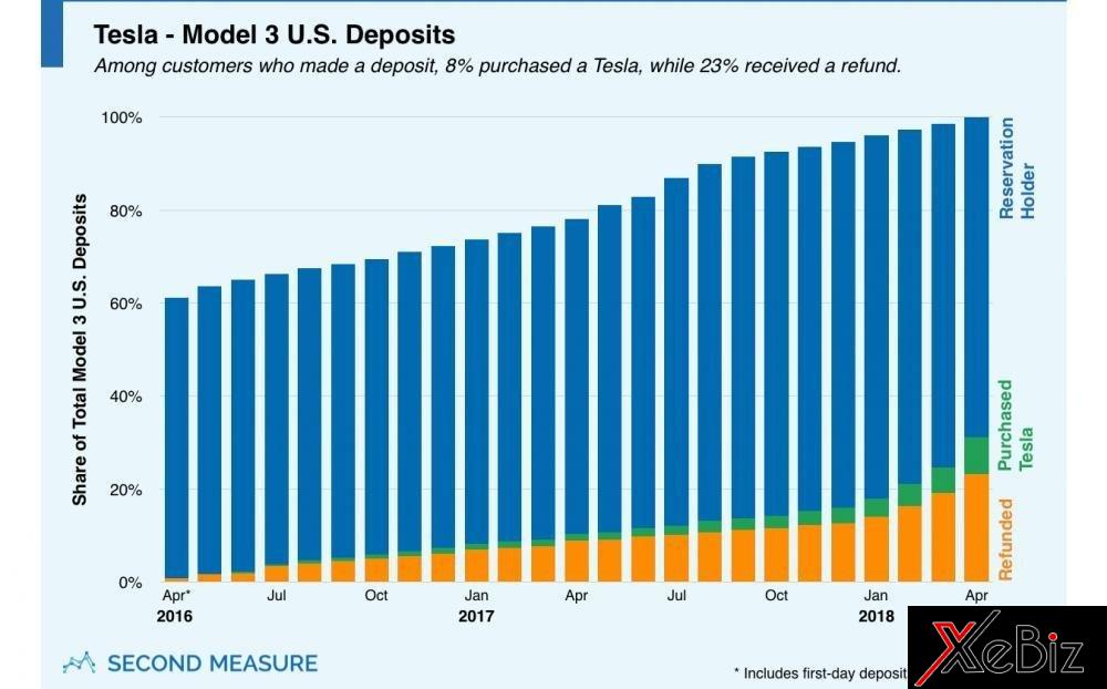 Biểu đồ so sánh số người đã đặt hàng trước, đã mua và đã nhận hoàn trả của Tesla Model 3 tại Mỹ, theo Second Measure
