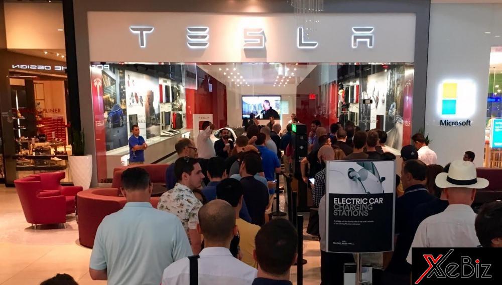 Hình ảnh khách hàng đứng thành hàng dài tại một cửa tiệm Tesla