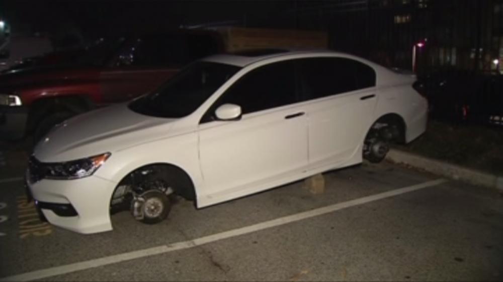 Trong cả 2 lần, những tên trộm đã kê gạch bên dưới gầm chiếc Honda Accord và lấy đi cả 4 bánh xe.