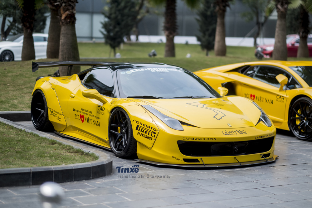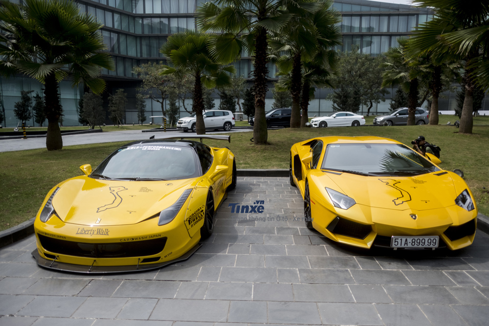Ferrari 458 Italia độ Liberty Walk đỗ cùng chiếc Lamborghini Aventador biển tứ quý 9.
