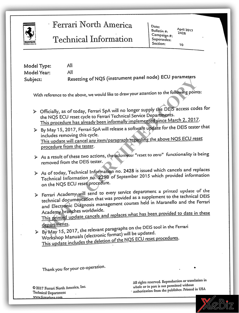 Nhìn vào những gì được viết trong bản ghi chú, người ta hoàn toàn có thể nói rằng Ferrari có biết chuyện đồng hồ công-tơ-mét có thể được tua lại thông qua công cụ kiểm tra DEIS. Bản ghi chú cũng gợi ý rằng bản hướng dẫn Ferrari Workshop Manuals cũng đã được biên tập để bỏ đi đoạn văn miêu tả cách tua lại công-tơ-mét.