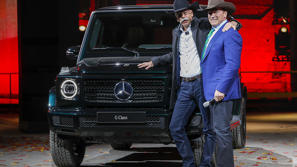 Vốn là người rất quan tâm đến việc bảo vệ môi trường, nam tài tử Hollywood đã hối thúc ông Zetsche phát triển phiên bản chạy điện của Mercedes-Benz G-Class. “Liệu G-Class có phiên bản chạy điện không”, Schwarzenegger hỏi. “Hãy chờ xem”, CEO  của Daimler trả lời ngắn gọn.