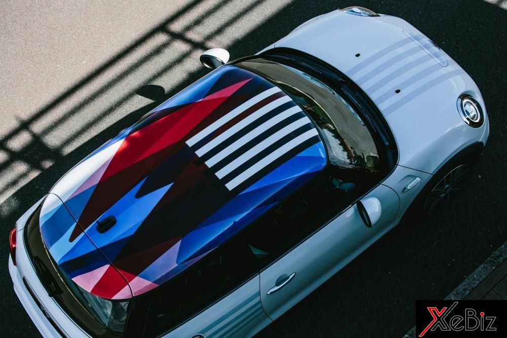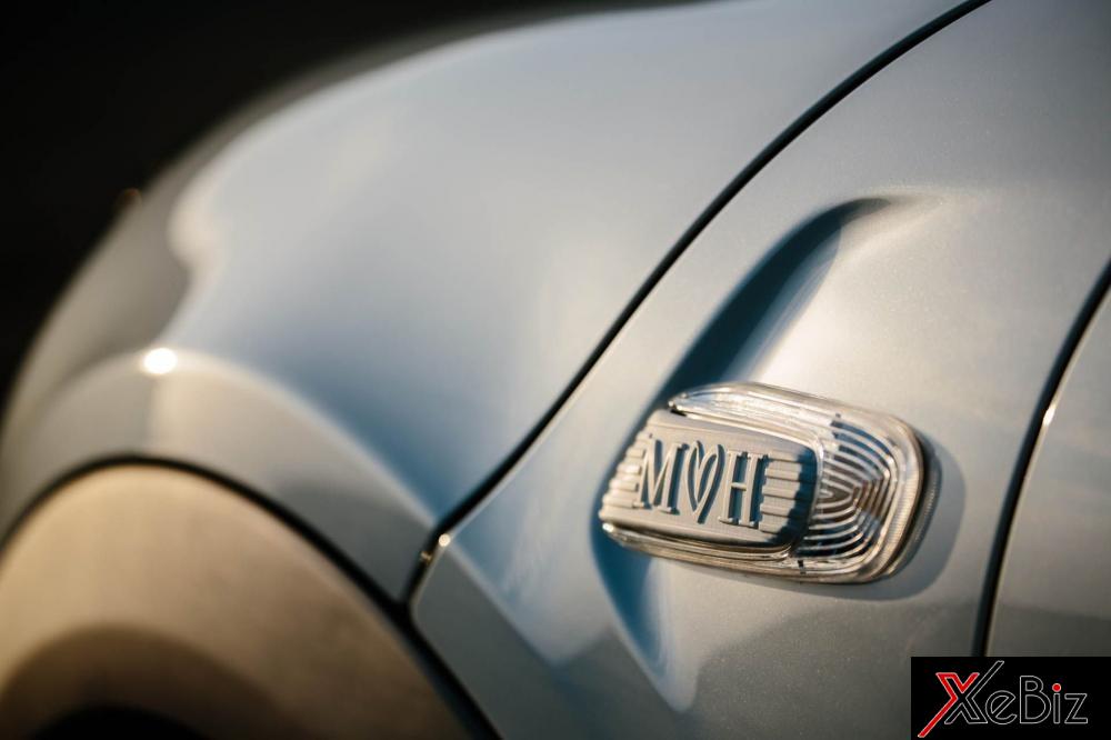 Chiếc Mini đặc biệt được sơn màu trắng pha lê Crystal White kết hợp với những nét tô điểm màu lam-bạc. Nhìn tổng quan ngoại thất của xe, người ta có dễ dàng nhận ra một sự phối hợp màu tinh tế và đẹp mắt. Hơn nữa, hai tấm ốp bên sườn cạnh chắn bùn trước còn được in 3D với hai chữ cái M & H. Chưa hết, xe có thể chiếu chữ “Just Married” trên mặt đất khi cửa mở ra.