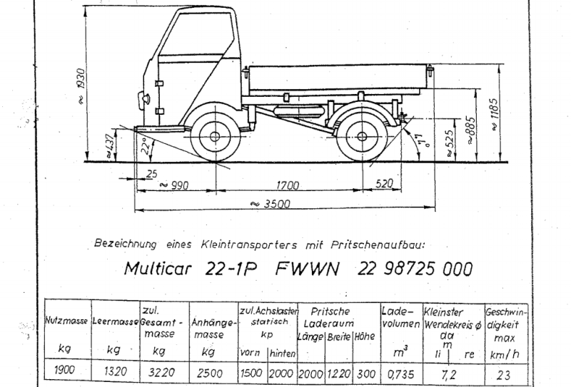 Thông tin chỉ số của Multicar M22 cho thấy nó có tải trọng (Nutzmasse) 1.900 kg và sức kéo (Anhaengemasse) 2.500 kg