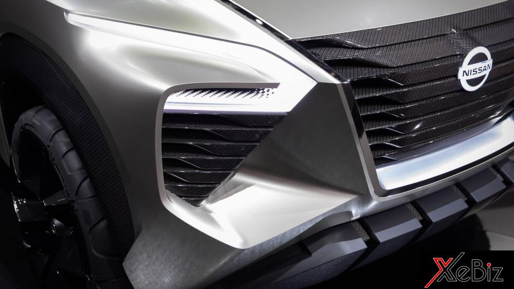 Khi nhìn chéo từ phía trước, ngôn ngữ thiết kế của Nissan được thể hiện rất rõ với cản sốc trước có kích thước lớn được thiết kế rất tỉ mỉ, qua đó mang lại cảm giác nuột nà cho phần đầu xe, đồng thời tạo cho xe sự hầm hố. Không dừng lại ở đó, màu sơn thiếc đặc biệt càng làm nổi bật hơn các đường nét thiết kế mà Nissan muốn hướng tới. Phần lưới tản nhiệt và vòm bánh xe được Nissan phủ bằng sợi carbon, tạo hiệu ứng cứng cáp cho thân xe, đồng thời làm nổi bật hơn hai chi tiết này.
