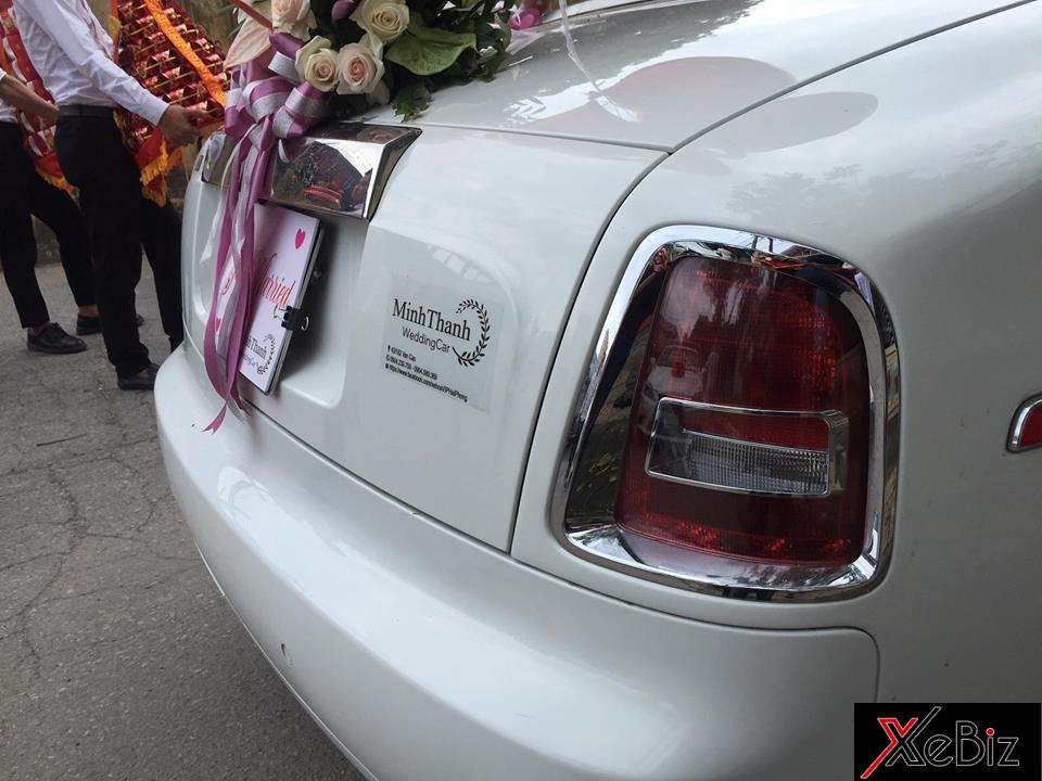 Chiếc Rolls-Royce Phantom Drophead Coupe mới làm xe đưa dâu tại Hải Phòng được trang trí hoa cưới cỡ lớn trên nắp capô, phía đuôi xe xuất hiện thêm hoa cưới và chùm bong bóng bay màu đỏ đẹp mắt.
