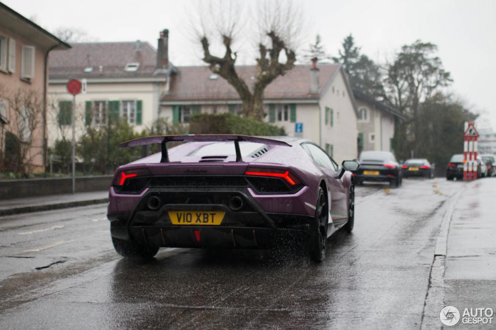 Lamborghini Huracan Performante mang ngoại thất màu tím bị bắt gặp tại Geneva, Thuỵ Sĩ.