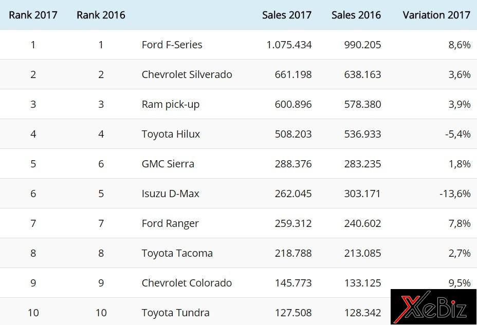 Danh sách các mẫu xe bán tải bán chạy nhất thế giới trong năm 2017 không có nhiều sự xáo trộn về thứ tự so với năm trước đó, dẫn đầu vẫn là Ford F-Series với doanh số lần đầu tiên vượt trên 1 triệu chiếc.