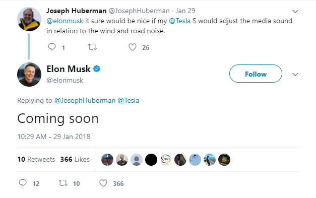 Gần đây nhất, có một khách hàng mang tên Joseph Huberman đã đặt vấn đề về khả năng tự động điều chỉnh âm thanh trong khoang lái của mẫu Model S dựa theo tiếng ồn bên ngoài. Ông Musk sau đó đã nhanh chóng phản hổi: “Sẽ sớm thôi.”